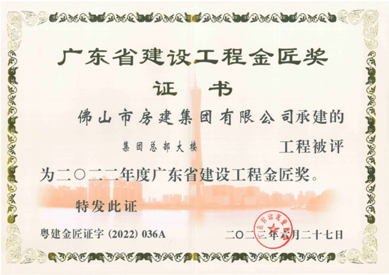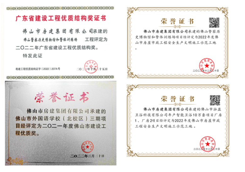 打鐵仍需自身硬,佛山房建集團(tuán)一直秉承“精心策劃、施工創(chuàng)新、信守合同、質(zhì)量第一”的質(zhì)量方針,嚴(yán)抓工程質(zhì)量關(guān),創(chuàng)先爭優(yōu),建安心工程。過去的2022年,在全體房建人的共同努力下,“集團(tuán)總部大樓”項(xiàng)目榮獲廣東省建筑行業(yè)工程質(zhì)量最高榮譽(yù)的“金匠獎”,新城路項(xiàng)目獲省級市政優(yōu)良樣板工程,另佛山市外國語學(xué)院、佛山市警察博物館、佛山市弘盈衛(wèi)浴廠房等項(xiàng)目分獲省、市級獎項(xiàng)。