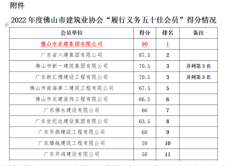 為推動建筑行業(yè)誠信體系建設(shè),鼓勵企業(yè)積極響應(yīng)、支持、參與行業(yè)發(fā)展工作,佛山市建筑業(yè)協(xié)會舉辦“履行義務(wù)五十佳會員”評選活動,我司榮獲2022年度“履行義務(wù)五十佳會員”第一名。